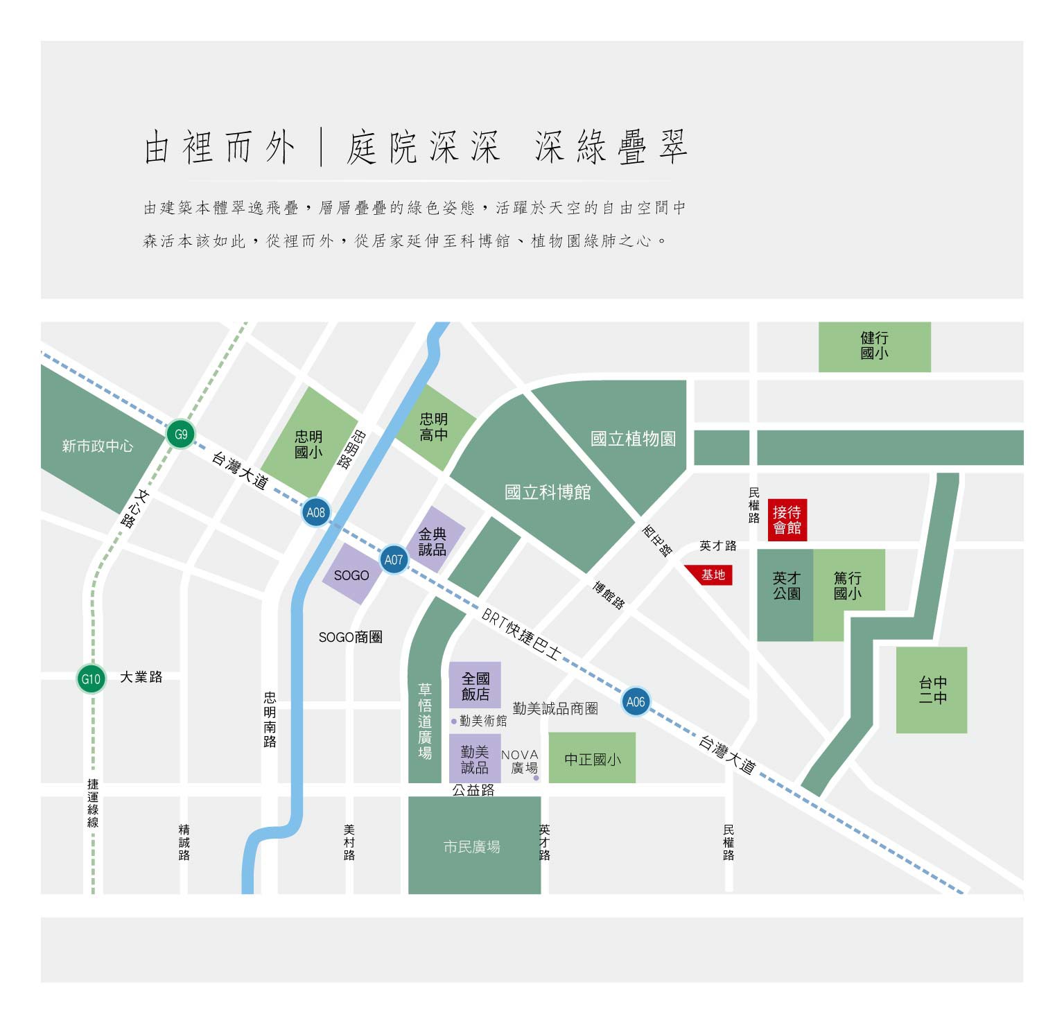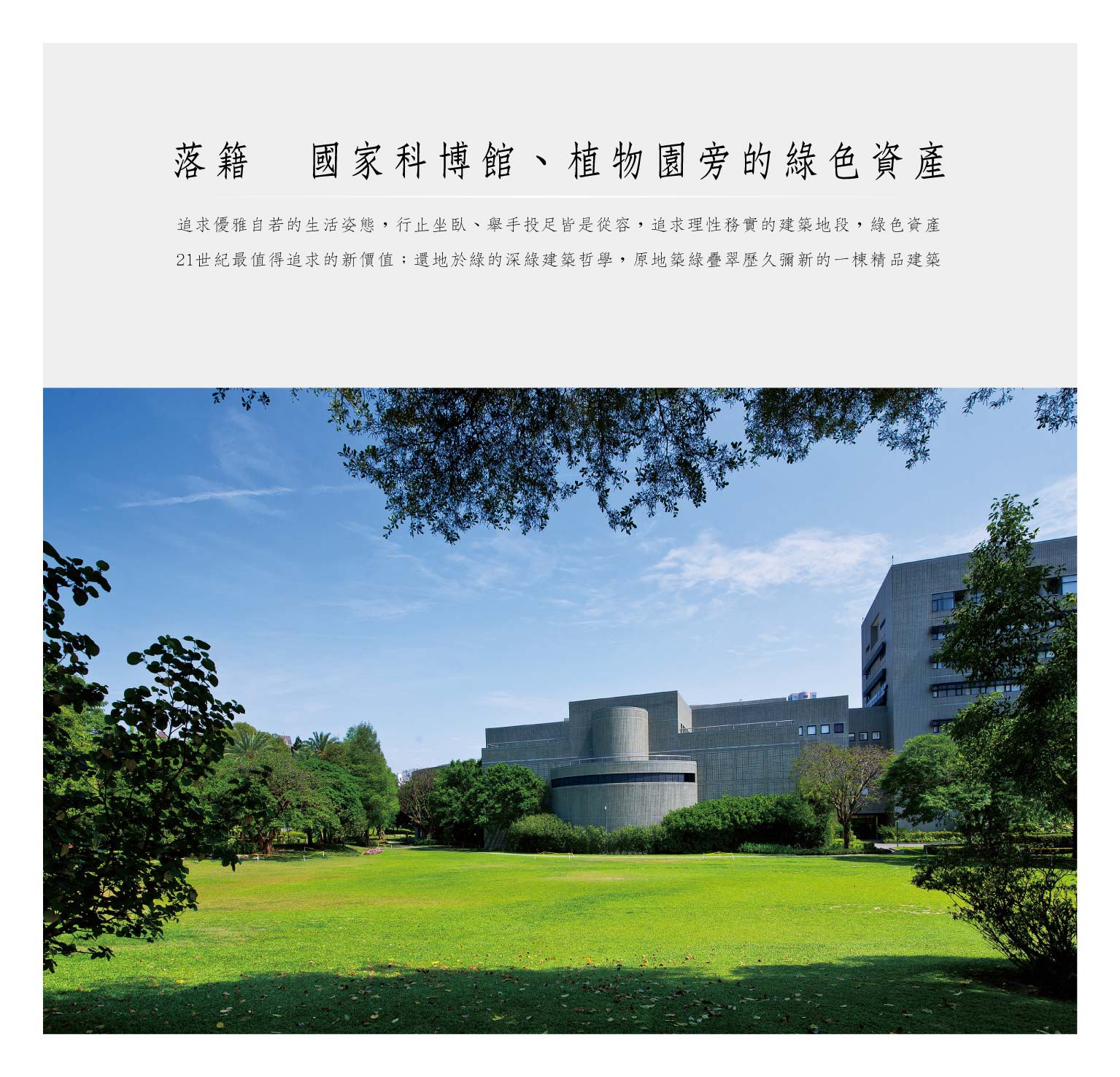 追求優雅自若的生活型態,行止坐臥、舉手投足皆是從容,追求理性務實的建築地段,綠色資產21世紀最值得追求的新價值;還地於綠的深綠建築哲學,原地築綠疊翠,歷久彌新的一棟精品建築