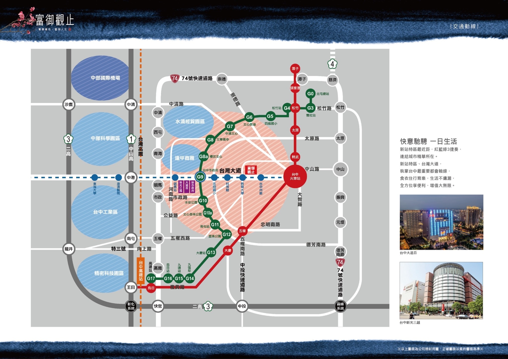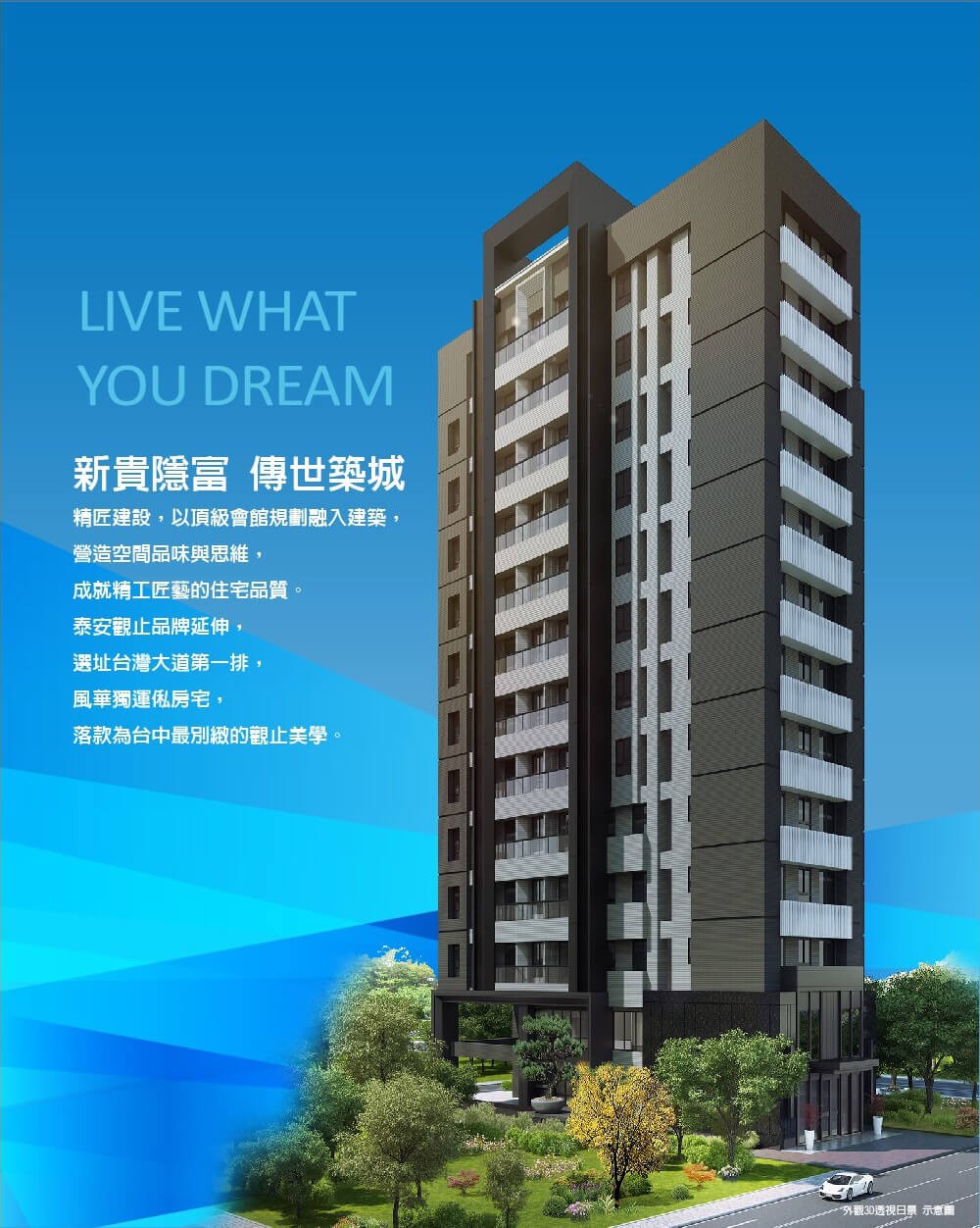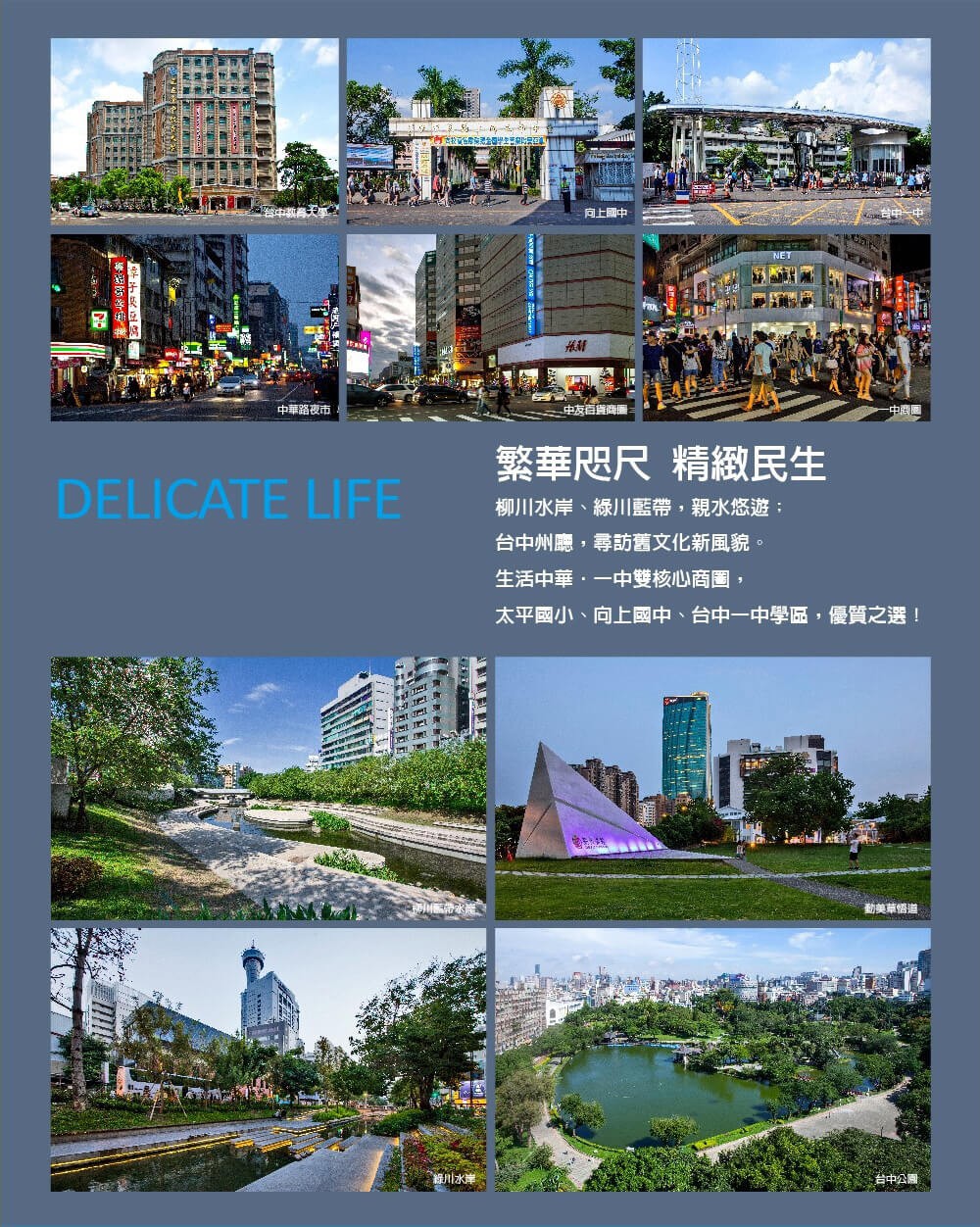 城市闊界,首席風華,位於台中正台灣大道, 繁華咫尺,精緻民生,居於中區精華生活圈, 新貴隱富,傳世築城,成就了精工匠藝的住宅品質, 精華薈萃,富御人生,落款為精美別緻的觀止美學, 五感豐華,細膩生活,專屬於您的俬房寓所。